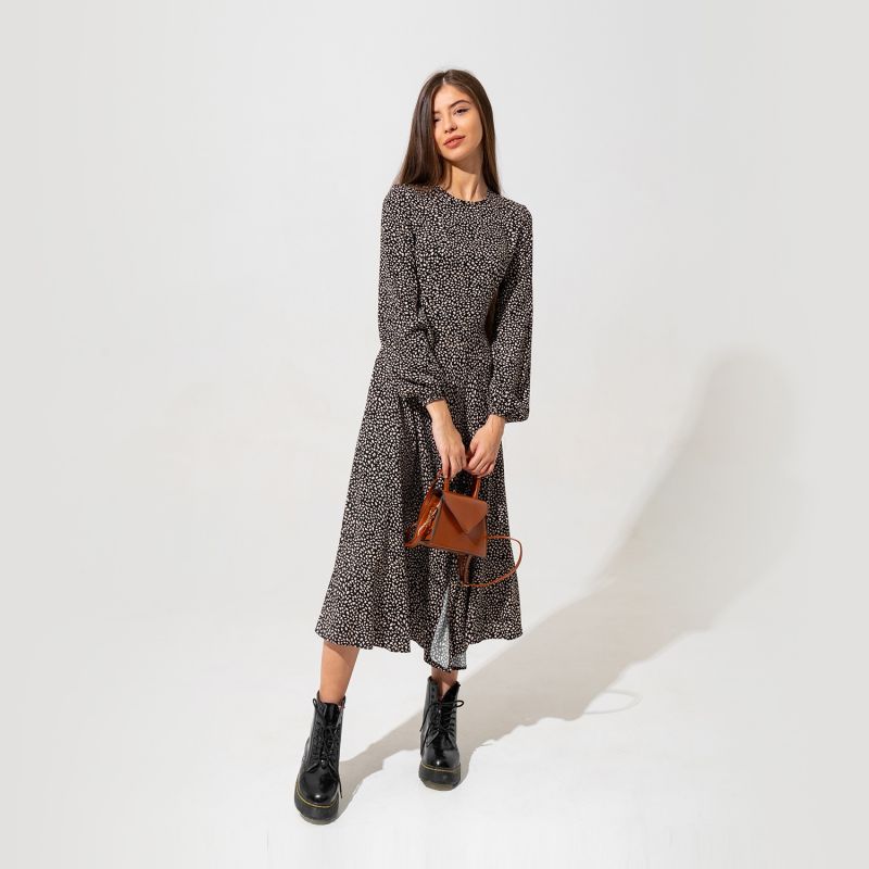 فستان أسود مع طبعات بيضاء منقطة ، له رقبة مستديرة ،
