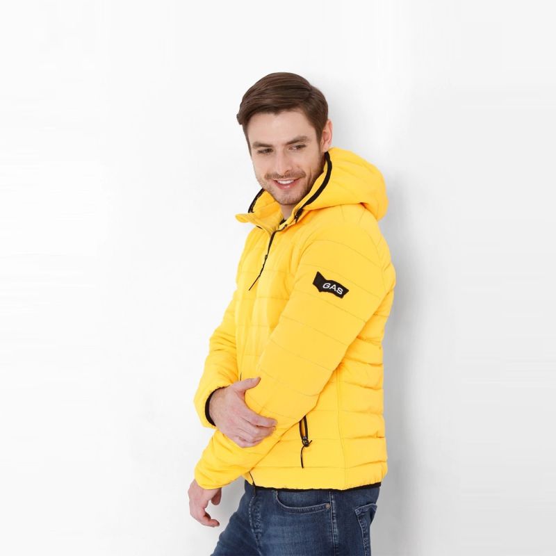 Yellow striped puffer jacket, has a hooded, 2 pockets ,has a zip closure, long sleeves, straight hemline, polyester lining.