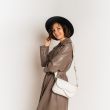 Brown solid faux leather font-open longline trench coat, has notched lapel collar, long sleeves and single vented hem