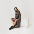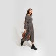 Black dress with white dotted prints, has a round neck, three-quarter sleeves.