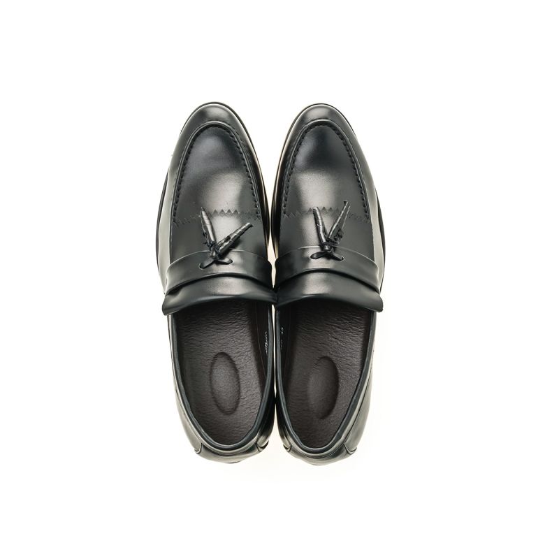 A pair of Black solid pointed toe formal slip-ons has tassel moccasin, has a slip-on closure