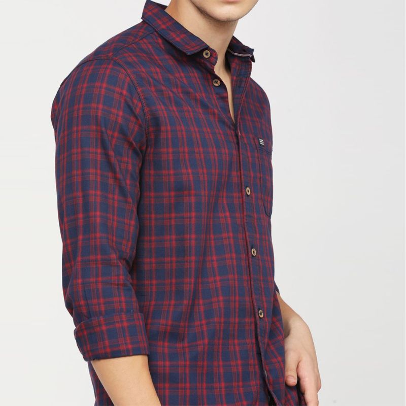Maroon and Navy Blue checked casual shirt, has a spread collar, long sleeves, button placket, curved hem, and 1 patch pocket.